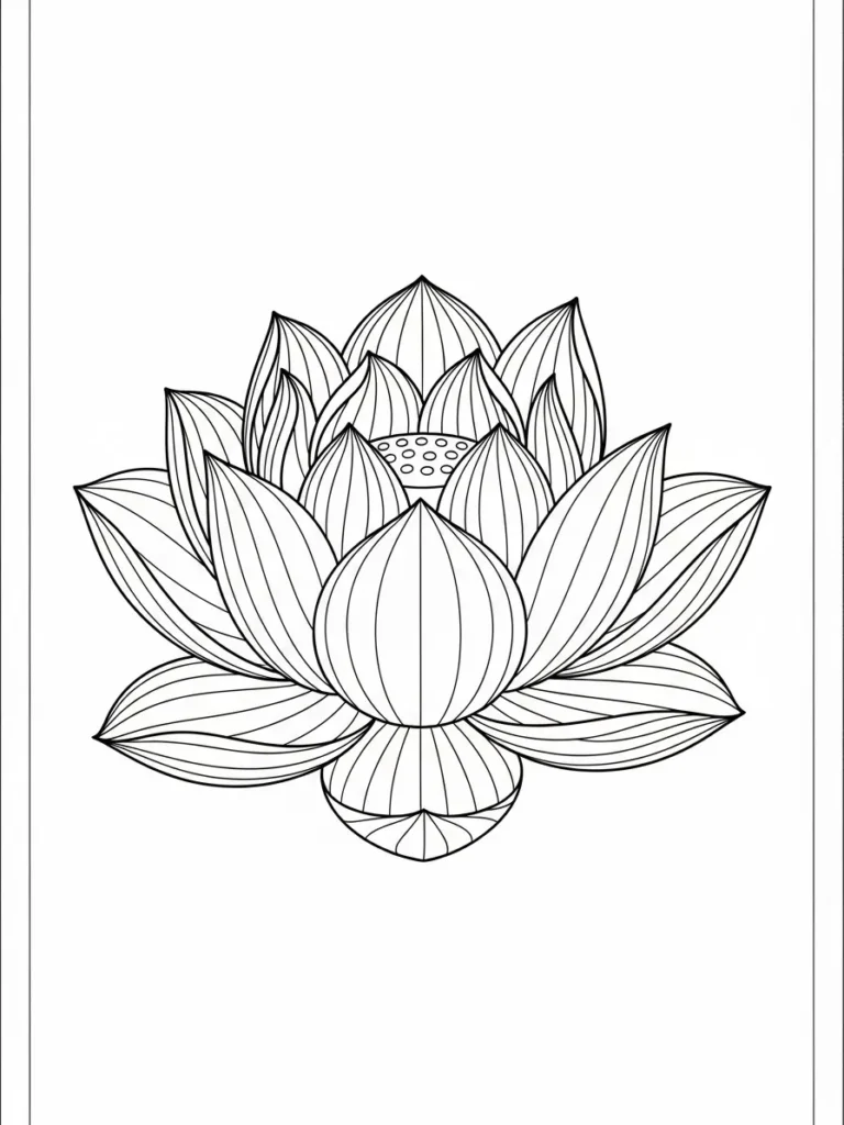 This coloring page features a beautifully centered lotus flower with layered petals arranged in a clean symmetrical layout. Each petal is outlined with smooth gentle curves and subtle inner line details that add texture without overwhelming the design. The lines are slightly bold and consistent which makes the shape feel grounded and balanced. Plenty of open space surrounds the lotus which keeps the overall look peaceful and uncluttered.