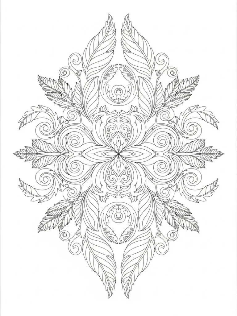 This coloring page features a detailed mandala built from flowing feather shapes and curling decorative lines arranged in perfect symmetry. Each section mirrors the next which creates a sense of balance and calm while still offering plenty of intricate detail. The line work is fine and graceful with layered curves that guide your eye toward the center. The overall layout feels elegant and intentional without feeling overwhelming.