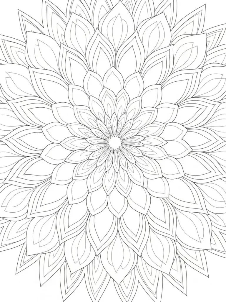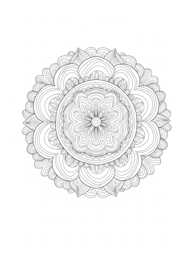 This coloring page features a large circular floral mandala made up of many layered petal shapes radiating from the center. Each petal repeats in a smooth rhythmic pattern with gentle curves and clean thin lines that feel elegant and calming. The design builds outward gradually which creates a beautiful sense of balance and symmetry without feeling stiff. There is plenty of detail to enjoy while still keeping the overall layout soft and harmonious.