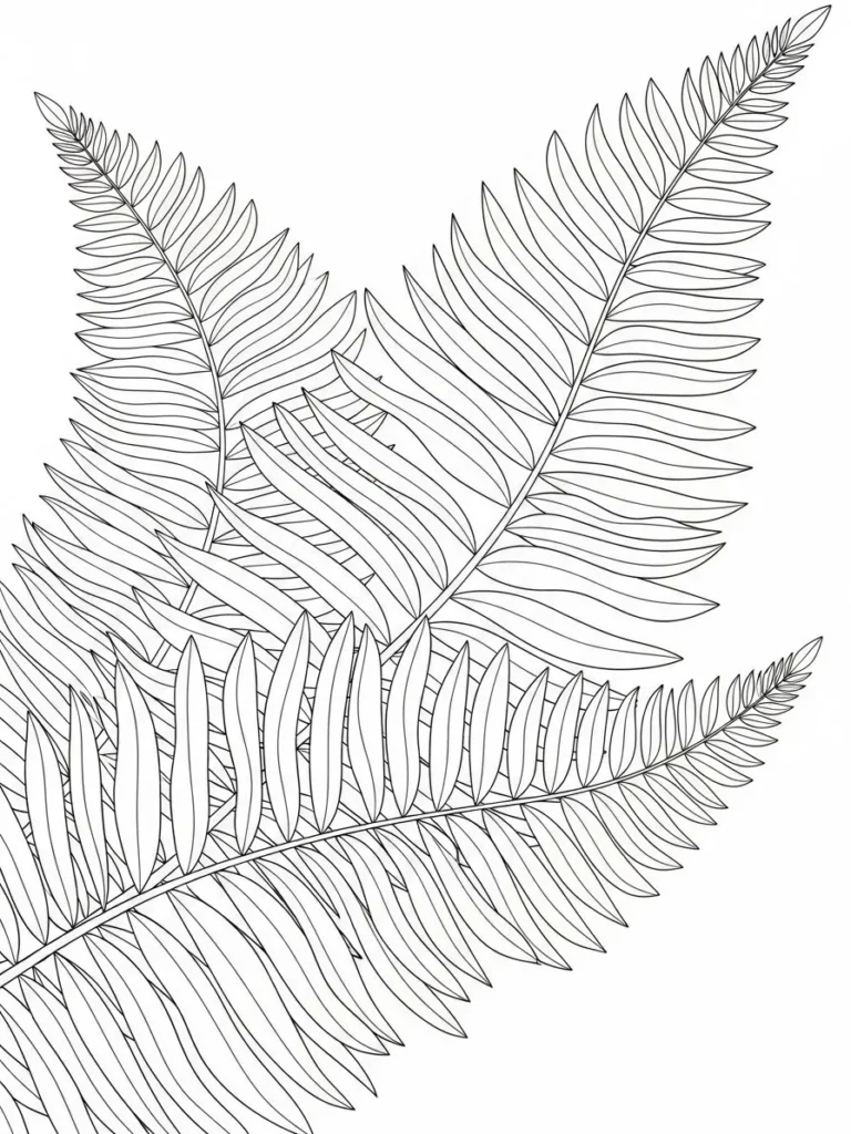 This coloring page features overlapping fern fronds drawn with long graceful stems and rows of narrow repeating leaves. The lines are thin and consistent which gives the design a light natural feel without feeling busy. Each frond curves gently and overlaps slightly creating depth while still keeping the layout open and airy. The pattern feels organic and calming with plenty of space to enjoy slow careful coloring.