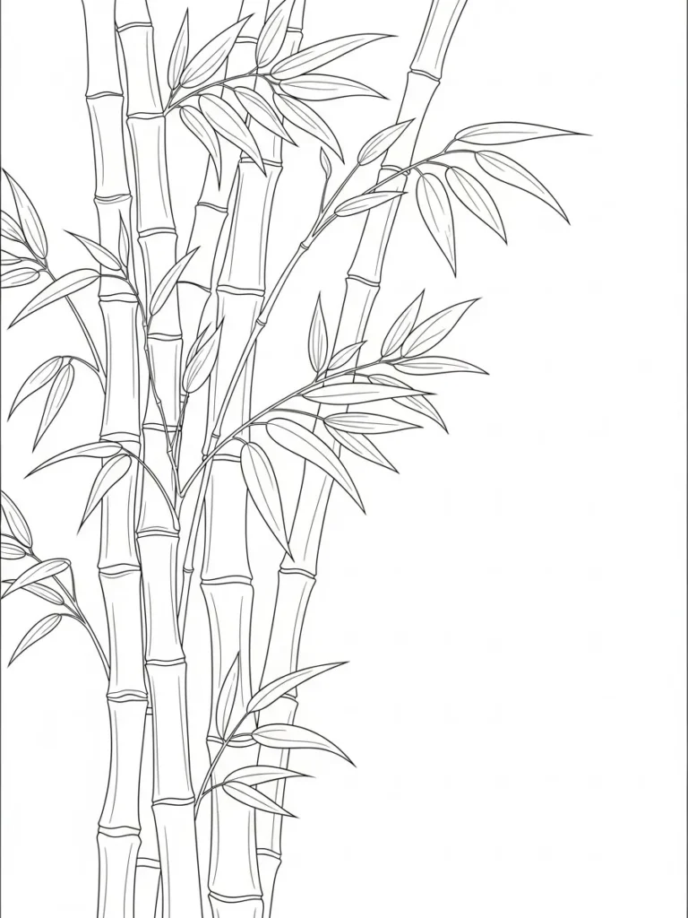 This coloring page features a graceful bamboo arrangement with tall slender stalks rising vertically and soft leafy branches extending outward. The lines are thin and clean which gives the design a light airy feel without feeling empty. Each bamboo segment is clearly defined while the leaves overlap slightly to create natural movement. The open background keeps the layout calm and uncluttered which makes the whole page feel balanced and soothing.