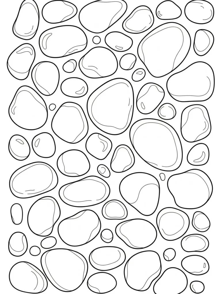 This coloring page is filled with rounded river stones arranged in an easy flowing all over pattern. Each stone has soft organic shapes with gentle inner contour lines that add depth without making things busy. The line thickness is clean and slightly varied which keeps the stones distinct while still feeling relaxed. The layout feels natural and evenly spaced like pebbles resting at the bottom of a quiet stream.