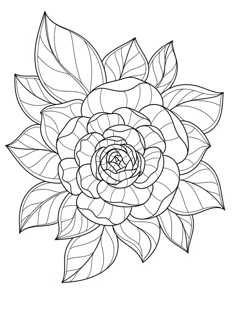This coloring page features a large detailed flower arranged in a gentle mandala style layout. Layered petals spiral inward toward the center creating a calm sense of movement without feeling too busy. The leaves frame the bloom beautifully with smooth curves and fine inner veins that add texture. Line thickness stays clean and balanced which makes each section easy to color while still offering plenty of detail to enjoy.
