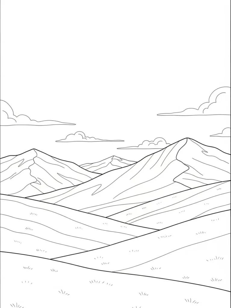 This coloring page shows a wide open landscape with gently rolling hills leading toward soft mountain peaks in the distance. The lines are smooth and minimal with light contour details that guide the eye without crowding the page. Small grassy textures are scattered across the hills and a few simple clouds float above which keeps everything calm and spacious. The overall layout feels open and balanced with lots of room to breathe and color freely.