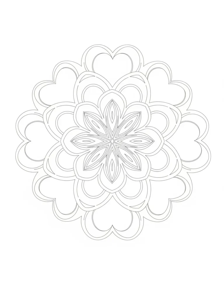 This coloring page features a delicate mandala built from repeating heart shapes arranged in a perfectly balanced circular pattern. The hearts layer outward from a small detailed center and grow slightly larger as they expand which creates a gentle flowing rhythm. The lines are thin and even giving the design a light graceful feel that never feels heavy. The open spacing between layers keeps everything airy while still offering plenty of sections to color.