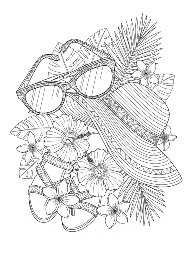 This coloring page features a playful summer arrangement with a wide brim sun hat, oversized sunglasses, strappy sandals, and lush tropical flowers layered together in a flowing composition. Palm leaves and hibiscus blooms weave through the design, creating movement and a breezy vacation feel. The line work is clean and detailed with decorative patterns inside the hat, sunglasses, and sandals, while the flowers and leaves add softer organic shapes. Everything is balanced in a vertical layout that feels full without being overwhelming, making it perfect for an adult coloring page that still feels light and sunny.