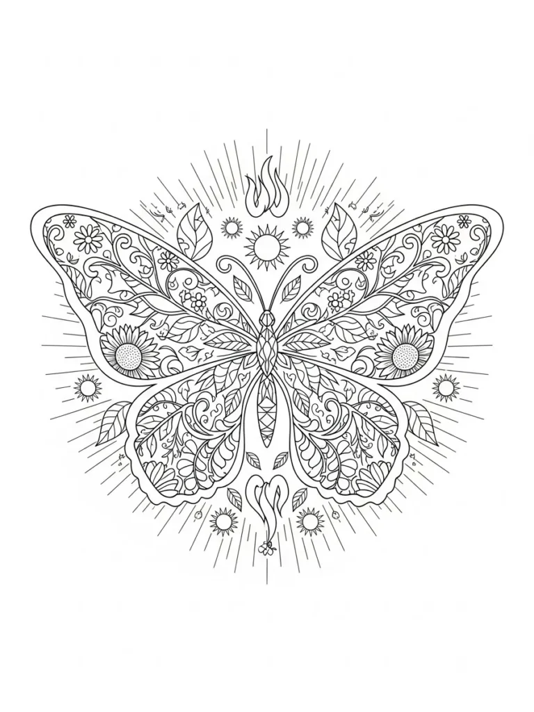 This coloring page features a beautifully symmetrical butterfly filled with intricate floral patterns, swirling lines, and leafy details. The wings spread wide and are packed with fine line work that flows naturally from the center outward, while small sun shapes and glowing rays surround the butterfly for a warm summer feel. The outlines are clean and well defined, with delicate interior patterns that add depth without making the design feel heavy. The overall layout feels balanced and airy, giving the butterfly plenty of space to shine.