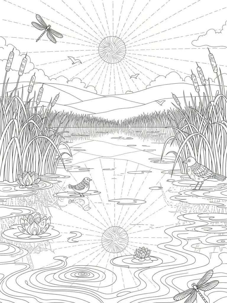 This coloring page shows a calm summer wetland scene with tall reeds, flowing water, and gentle rolling hills in the background. A radiant sun sits high in the sky with long sun rays spreading outward, mirrored softly in the water below. Water lilies float across the pond while small birds rest on the surface and glide through the air. Dragonflies add light movement near the edges, and the line work mixes smooth flowing curves with fine details in the plants and reflections. The layout feels open and balanced, giving plenty of space to enjoy both detailed areas and larger sections for color.