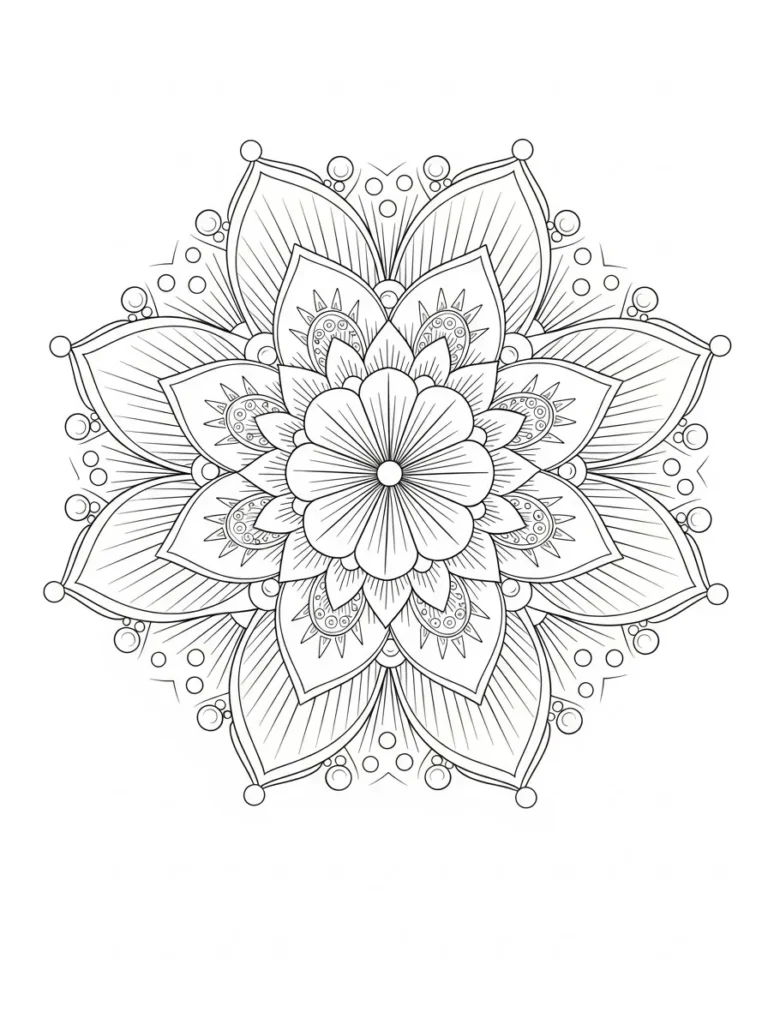 This coloring page features a beautifully symmetrical floral mandala inspired by blooming summer petals. Layers of rounded and pointed petals radiate outward from a soft central flower, creating a balanced and calming circular layout. The line work is crisp and clean with a mix of fine detailing and slightly thicker outlines that help each section stand out. Decorative dots and gentle curved patterns fill the spaces between petals, giving the design depth while still feeling airy and elegant.