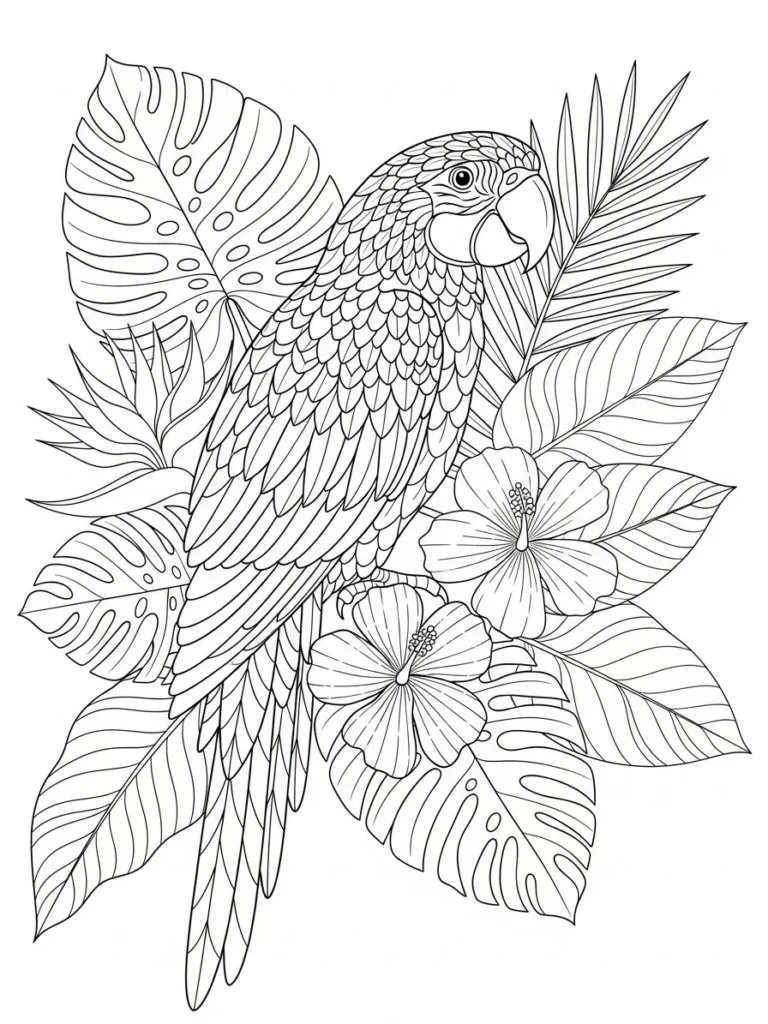 This coloring page features a striking tropical parrot perched among oversized monstera leaves, palm fronds, and blooming hibiscus flowers. The bird is the clear focal point, with beautifully layered feathers drawn in clean, detailed lines that feel satisfying to color. The surrounding leaves and florals frame the parrot naturally, creating a full yet balanced composition. Line thickness varies just enough to separate feathers, petals, and foliage, giving the page depth while keeping everything crisp and easy to follow.