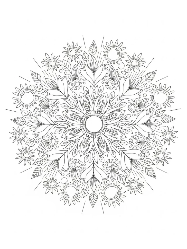 This coloring page features a beautifully balanced mandala inspired by sunshine and blooming summer florals. A soft round center anchors the design, with layered petals, leaves, and tiny sun shapes radiating outward in perfect symmetry. The line work is clean and elegant, mixing fine details with slightly thicker outlines that keep each section clear and satisfying to color. The overall layout feels airy and joyful, with repeating patterns that flow naturally around the circle without feeling crowded.