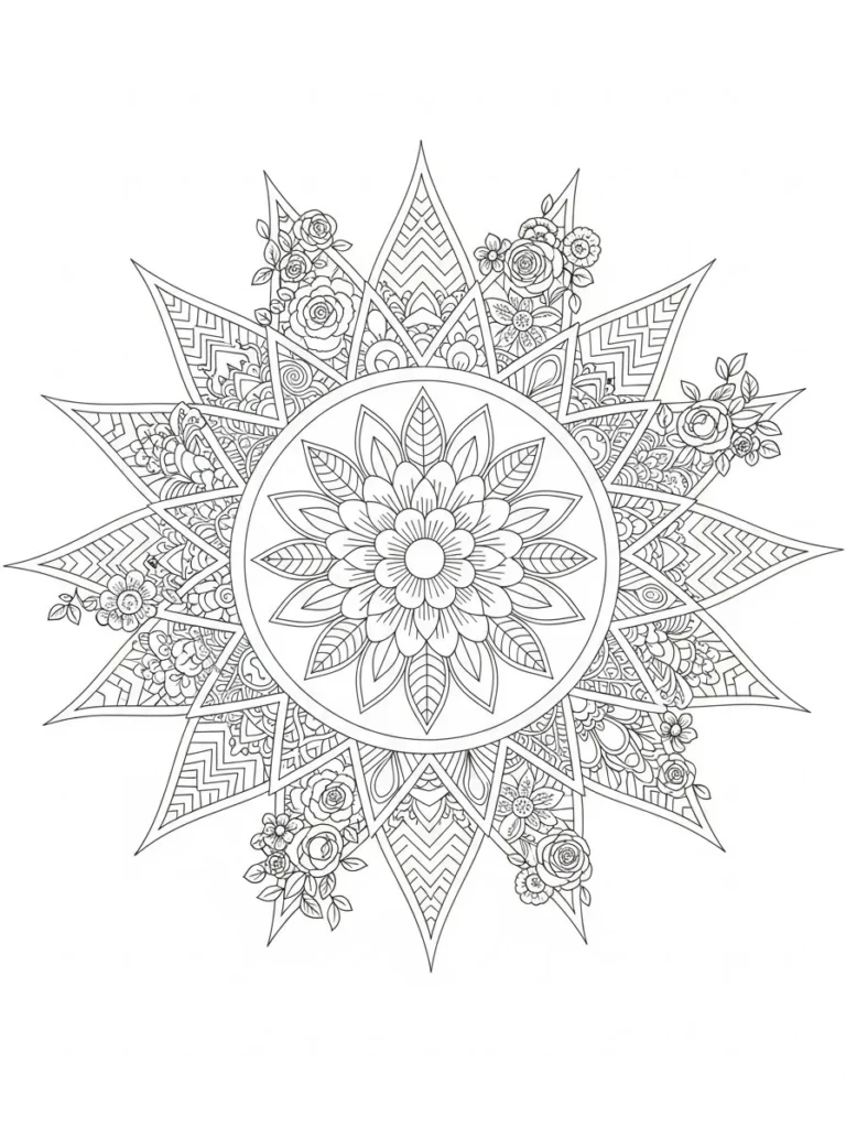 This coloring page features a bold sun inspired mandala with a floral center and radiant pointed rays spreading outward. The middle circle holds layered petals that feel soft and balanced, while the outer sections mix geometric patterns with tiny roses and leafy accents. Clean line work keeps each section clear, with fine details tucked inside the shapes and slightly thicker outlines guiding the overall design. The layout feels energetic and symmetrical, giving the impression of a glowing summer sun filled with floral charm.