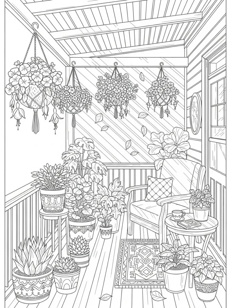 I love coloring scenes like this because it feels like stepping into my dream summer corner. Choosing greens for the plants is surprisingly calming, and I enjoy adding little pops of color to the pots and cushions. If you’re into cozy home vibes, this page feels especially comforting and slow in the best way. It always makes me want to grab a drink, sit back, and enjoy the quiet while my coloring pencils do the rest.