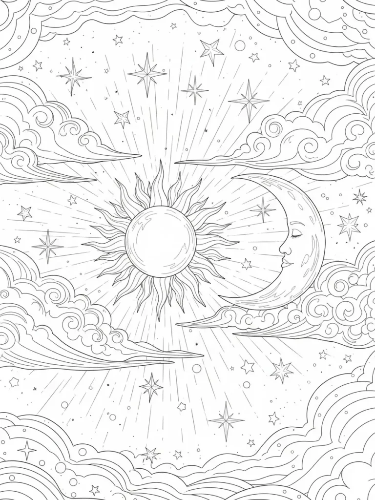 This coloring page features a glowing sun with flowing flame like rays paired with a calm crescent moon showing a peaceful face. They float among layered, swirling clouds that wrap gently around the scene. Fine stars, sparkles, and soft celestial details fill the background, creating a balanced sky that feels dreamy and open. The line work is clean and delicate with plenty of intricate sections in the rays, clouds, and stars while still leaving breathable spaces that make the overall layout feel soothing rather than busy.