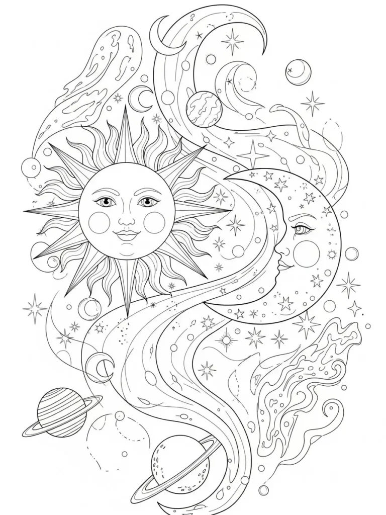 This coloring page features a radiant sun and a graceful crescent moon drifting through a flowing celestial scene filled with stars, planets, and swirling cosmic waves. The sun has a soft friendly face with long radiant rays, while the moon curves gently alongside, decorated with tiny stars and delicate dots. Ribbon like streams of stardust move through the page, connecting planets, crescents, and sparkles into one dreamy vertical composition. The line work is fine and detailed with lots of motion, giving the whole design an airy and magical feel that still feels balanced.