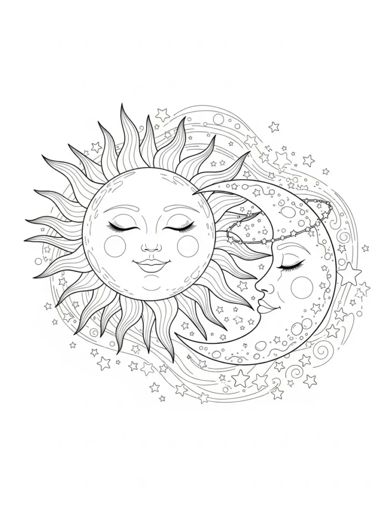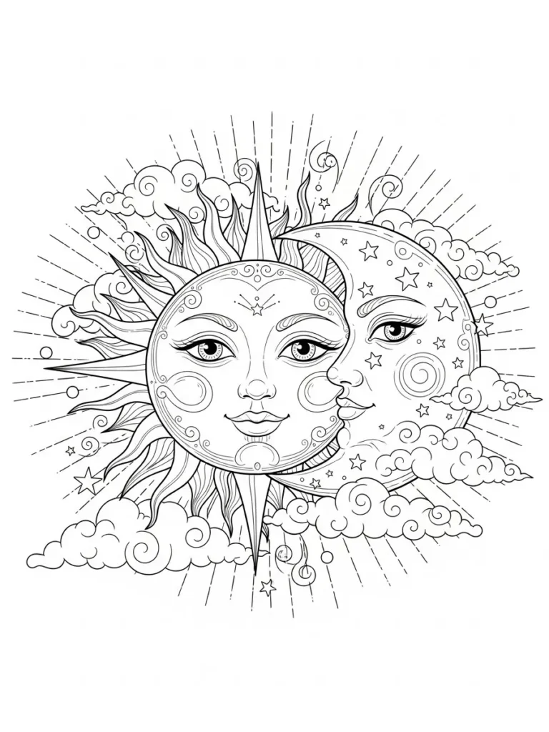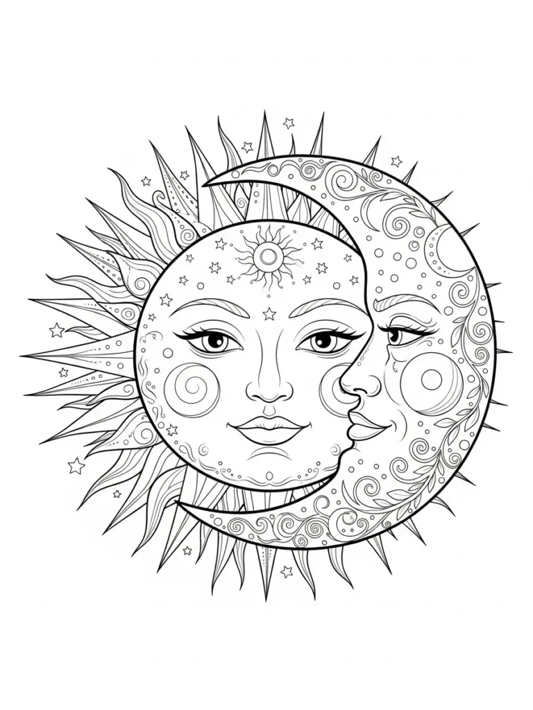 This coloring page features a radiant sun face nestled closely with a graceful crescent moon, both sharing soft expressive features that feel calm and connected. The sun rays stretch outward in layered spikes and flowing lines, while the moon is filled with swirling patterns, dots, and gentle curves. Tiny stars are scattered throughout the design, adding a light celestial touch without crowding the main figures. The line work is clean and detailed, offering a mix of bold outlines and finer patterns that create depth while keeping the composition clear and harmonious.