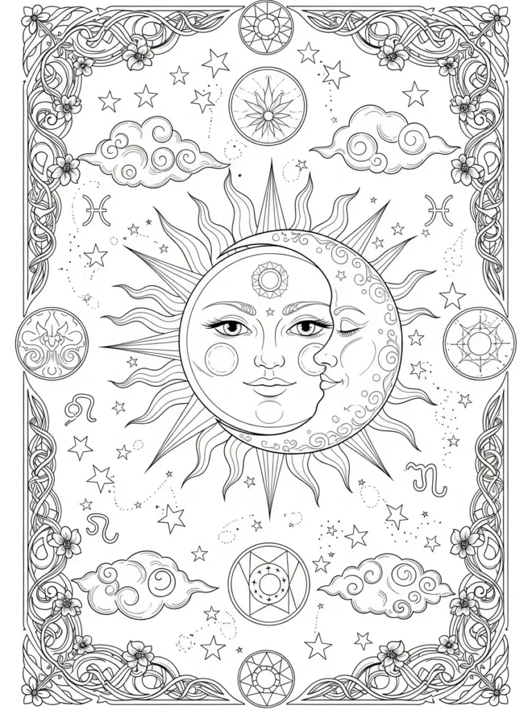 This coloring page features a beautifully detailed sun and moon sharing the center, with expressive faces that feel calm and harmonious. Radiating sun rays stretch outward while the crescent moon curves gently alongside, both filled with delicate patterns and soft line work. The background is sprinkled with stars, clouds, zodiac symbols, and geometric celestial icons that add depth and interest without overpowering the main design. An ornate floral and vine border frames the entire page, giving it an elegant finished look that feels rich and intentional.