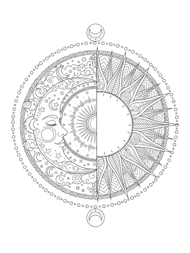 This coloring page blends a detailed mandala sun with a graceful crescent moon, both sharing the spotlight in a beautifully balanced design. The sun is filled with layered geometric petals and radiating rays, while the moon features soft facial details, swirling patterns, stars, and tiny planetary accents. Fine dots and sparkles scatter through the background, adding texture without overwhelming the main shapes. The line work is crisp and intricate, offering plenty of small sections for careful coloring while keeping the overall layout centered and harmonious.