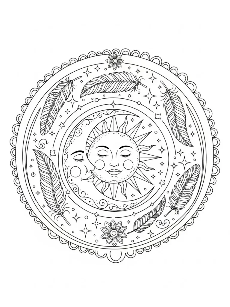 • Sun and Moon Mandala with Feathers and Soft Stars