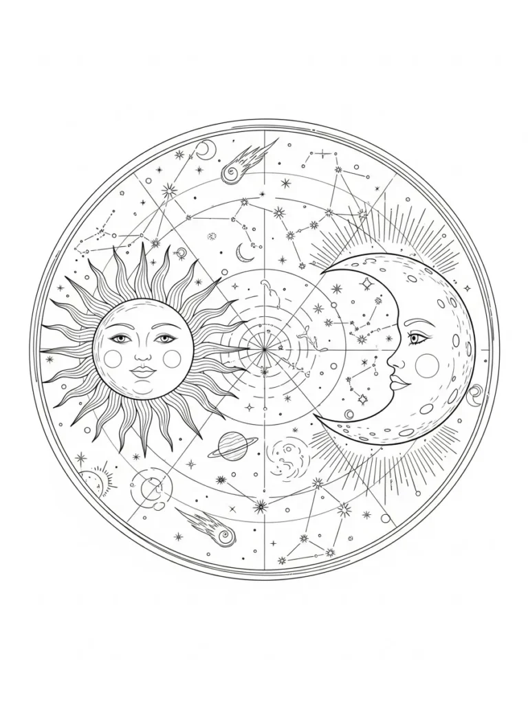 This coloring page looks like a detailed star map brought to life, with the sun on one side and the moon on the other inside a large circular frame. Fine constellation lines, tiny stars, comets, and planetary details fill the background, creating a sense of cosmic movement and connection. The sun shows soft expressive features with flowing rays, while the moon has a calm profile surrounded by delicate starbursts. The line work is clean and intricate, with lots of small sections that feel intentional and beautifully balanced across the circle.