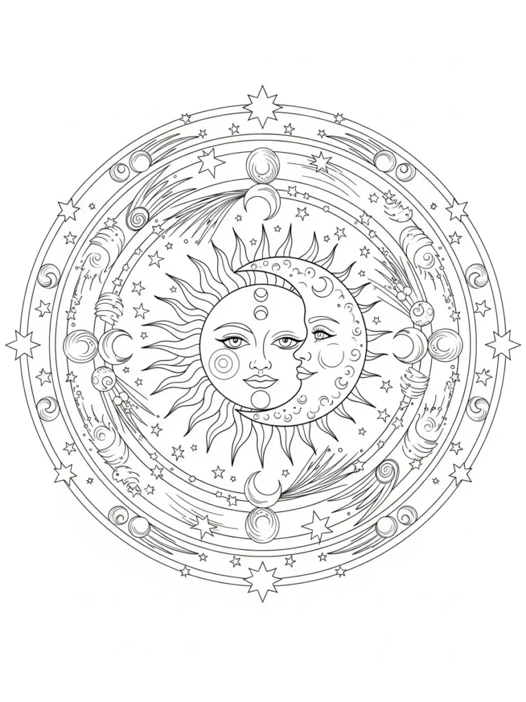 This coloring page shows a sun and moon merged together at the center, sharing a calm expressive face that feels balanced and serene. Radiating sun rays flow outward while the crescent moon curves gently alongside, creating a beautiful sense of harmony. Surrounding them are circular rings filled with stars, planets, shooting stars, and swirling cosmic patterns that move around the page like a quiet orbit. The lines are fine and detailed with lots of small sections that invite careful coloring while the overall round layout keeps everything feeling soft and cohesive.