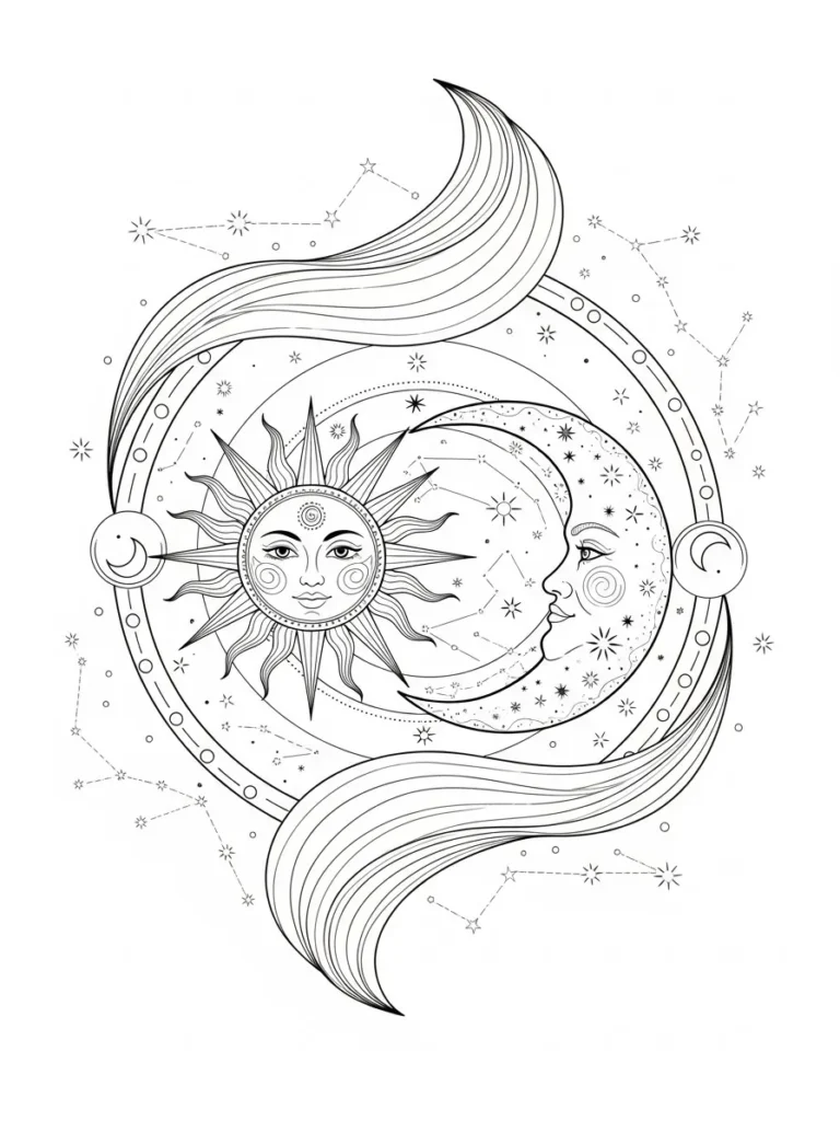 This coloring page shows a radiant sun and a serene crescent moon facing each other inside a circular celestial frame. Long flowing ribbon shapes sweep around the circle, creating a sense of movement that feels graceful and dreamy. Tiny stars, dotted constellations, and delicate sparkles fill the background, adding light detail without crowding the main figures. The line work is elegant and smooth with a mix of fine patterns and open spaces that keep the layout airy and balanced.
