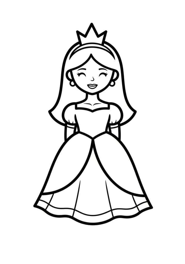 This coloring page features an adorable cartoon princess standing front and center, wearing a beautiful layered ball gown with elegant petal-like panels fanning out from the waist. She has long flowing hair, tiny drop earrings, and a classic pointed crown sitting on top of her head. The bodice has a sweet sweetheart neckline detail and little puffed sleeves that give her outfit so much charm. The lines throughout are bold and clean, making every section of her dress, hair and crown super easy to distinguish and fill in. The overall layout is simple and uncluttered with plenty of open space in the skirt panels just waiting for color.