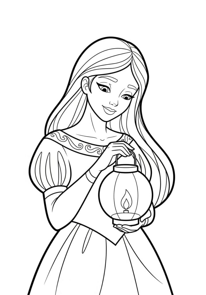 This page feels like it was made for a slow, peaceful evening coloring session with a cup of tea nearby. The fine lines reward a little patience and care, and the lantern is honestly the most exciting part to color because you can create this gorgeous warm glowing effect using ambers, golds and soft oranges for the light and then keep everything else in cooler tones to make it pop. I love how the scroll detail on the neckline gives you a tiny intricate section to focus on without overwhelming the rest of the page. It has a real storybook illustration quality that makes the finished piece look like something truly special.