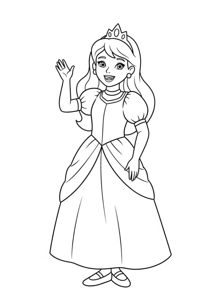 This page has such a warm, cheerful energy that it genuinely feels like the princess is waving directly at you, which is just too cute. She is drawn in a classic cartoon animation style, standing full length with one hand raised in a bright open wave and the other resting casually at her side. Her expression is full of joy with wide expressive eyes and a big open smile that makes the whole design feel really lively and fun. She wears a layered dress with a fitted bodice featuring a V-shaped panel detail at the waist and a wide flowing skirt that falls all the way to her flat pumps at the bottom. A small gem-detailed tiara sits neatly in her long side-swept hair, and the line work throughout is smooth and confident with clean outlines and just enough interior detail to make the dress feel dimensional without overcomplicating things.