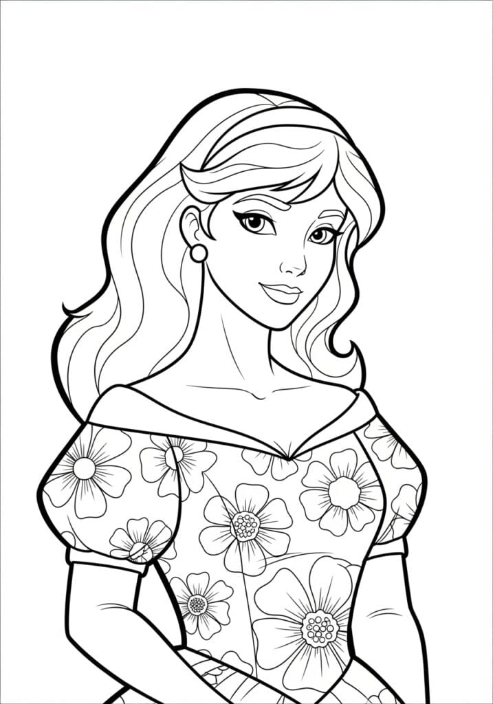 This page is giving serious fashion illustration vibes and it is genuinely one of the most striking designs in the whole collection. It features a close-up portrait of a beautiful, more mature-looking princess from the shoulders up, with long wavy hair swept to one side and sharp, confident facial features that give her a really glamorous presence. She wears an off-shoulder dress absolutely covered in large bold floral motifs, with big rounded blooms featuring detailed dotted centers scattered across the entire bodice. The flowers vary slightly in size which makes the pattern feel really natural and organic rather than stiff or repetitive. The line work on the face is fine and polished, while the floral pattern uses slightly bolder outlines that make each bloom easy to identify and color individually.
