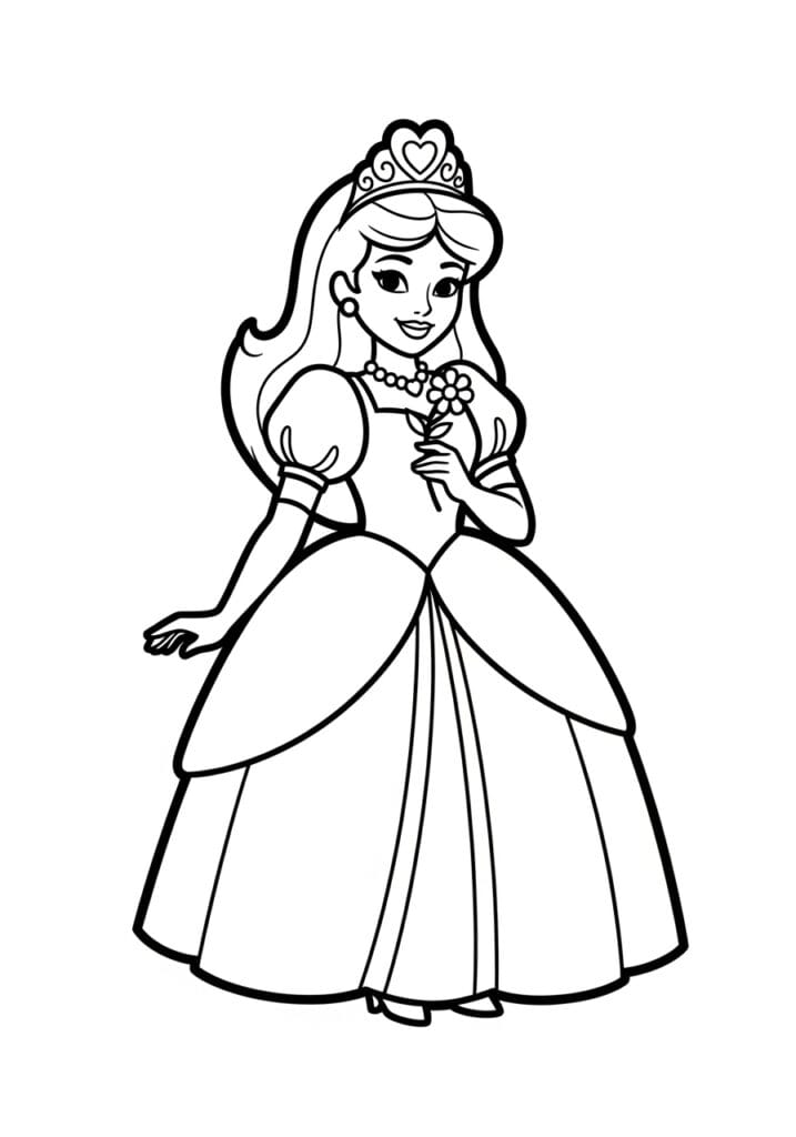 There is something so appealing about a princess who is just casually holding one little flower rather than a whole dramatic bouquet, and that single daisy detail makes this page feel really fresh and unassuming. The big layered skirt is absolutely perfect for a two-toned color approach since those rounded overskirt panels naturally separate from the underskirt below, and picking two colors that complement each other for those sections is genuinely one of my favorite parts of coloring pages like this. The heart tiara is also just begging to be done in rose gold or a shimmery pink. It all comes together into something that looks really polished and pretty without requiring a huge time investment.