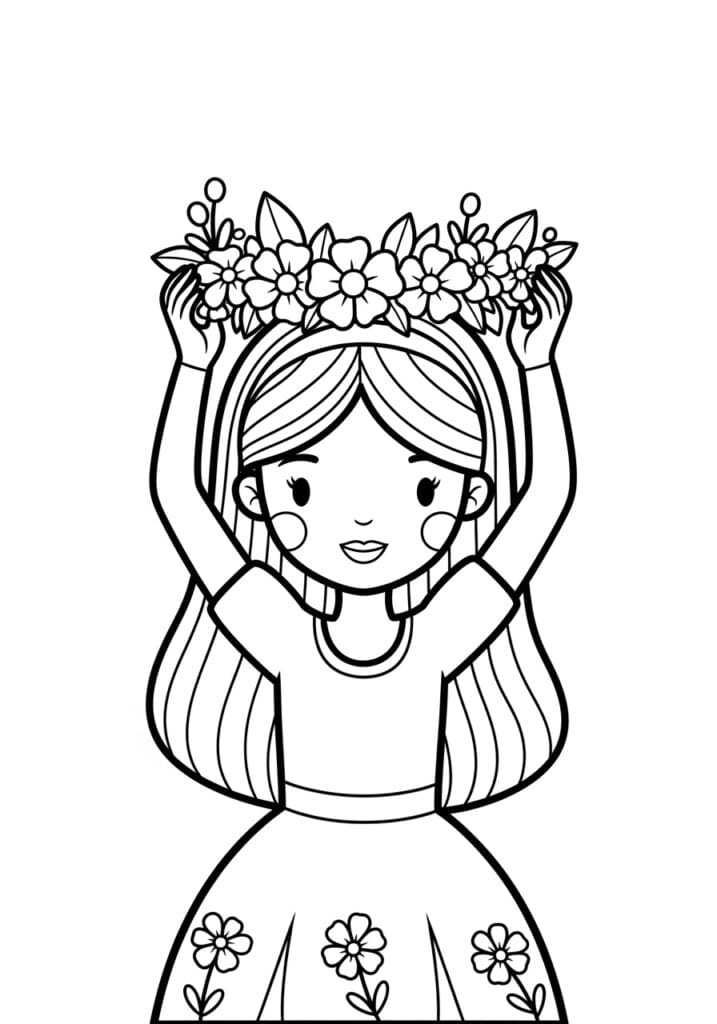 What I love most about this page is the pose because both arms raised just feels so celebratory and full of life compared to the usual standing still princess designs. The flower crown is where I would spend most of my time, going in with a totally different color for each little bloom to create that layered wildflower garden effect. The long straight hair sections are also really fun to color since you can do a subtle gradient or even try a fantasy color like soft lavender or warm auburn. The scattered daisies on the skirt are a quick satisfying finish that ties the whole thing together perfectly.