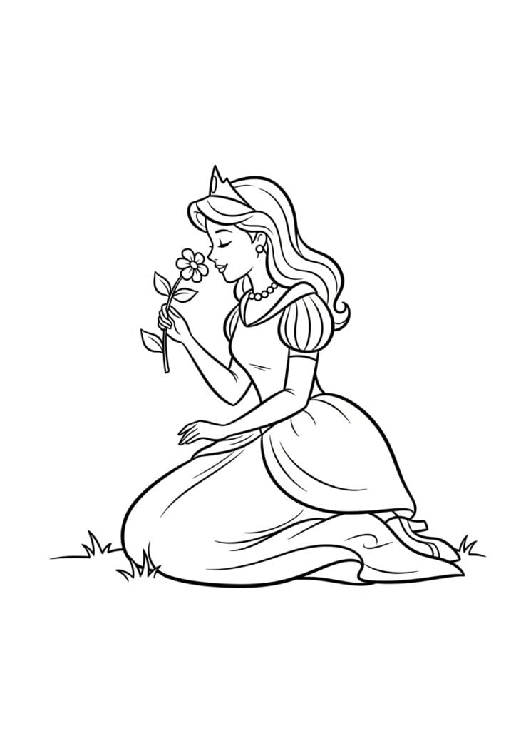 This page has such a quietly beautiful, unhurried quality to it that feels really different from the more posed standing princess designs. It shows a graceful princess seated on a patch of grass, her full skirt pooling softly around her as she leans gently forward to smell a single small flower she holds up in one hand. Her eyes are closed, her profile is elegant, and a simple small crown sits tucked into her loose wavy hair. She wears a pearl necklace and an off-shoulder dress with puffed sleeves, and the folds of her skirt spread out generously across the lower half of the composition. A few tufts of grass are sketched in at the base to ground the scene. The line work is smooth and fluid throughout, with a slightly looser, more natural style that gives the whole illustration a really gentle and organic feel.