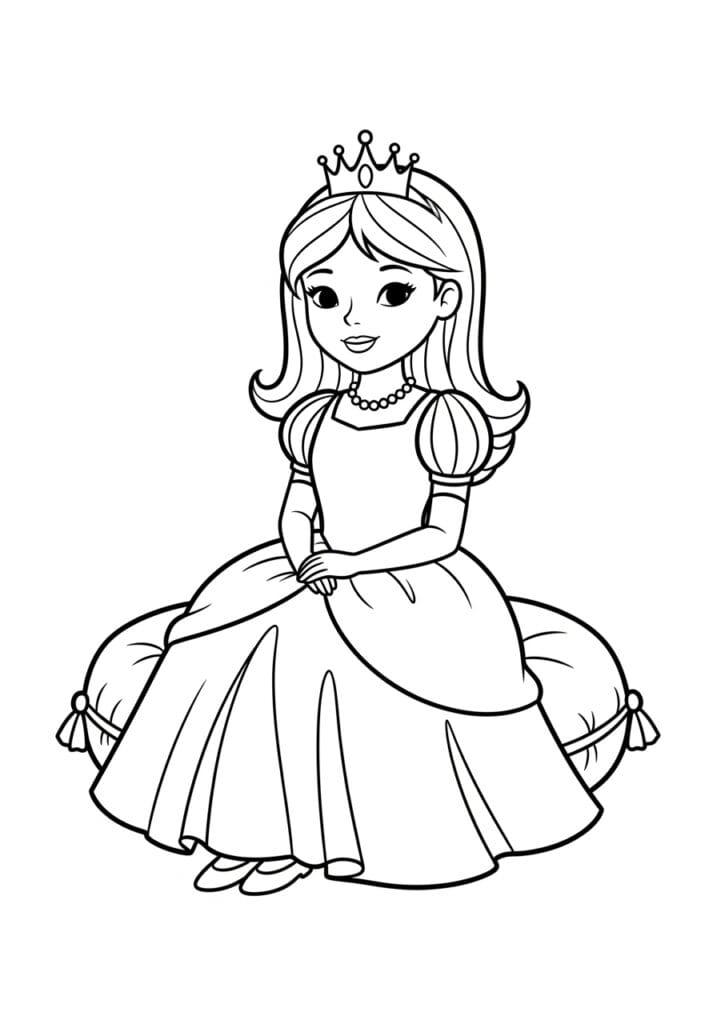 This design has a wonderfully regal, composed quality that feels like a proper royal portrait. The princess is shown seated, her layered ball gown spreading out elegantly around her with the skirt fanning into a wide smooth shape that fills the lower half of the page beautifully. On either side of her, partially visible beneath the skirt, are two plump cushions with little tassel details at the corners, giving the whole scene a very throne-room feel. She has wavy hair with curled ends, a pearl necklace, segmented puffed sleeves and a tall orb-tipped crown sitting neatly on top of her head. Her hands rest gently in her lap and her expression is warm and confident. The line work throughout is clean and consistent with smooth outlines and just enough interior detail on the sleeves and skirt layers to give the design real visual depth without overcomplicating things.