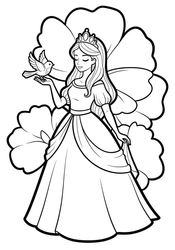 This design has such a fairytale quality to it that I genuinely had to stop and admire it for a second before even thinking about colors. The princess stands tall and elegant, one arm raised with a tiny bird perched right on her open hand, her eyes gently closed in that classic Disney-princess-in-the-forest kind of way. Her long flowing hair falls over her shoulders, and her tiara is beautifully detailed with little gem shapes along the band. She wears a graceful layered gown with soft draping across the skirt. Behind her, filling almost the entire background, are massive rounded flower petals and leaf shapes drawn with thick bold outlines that create a really striking contrast against the finer lines used for the princess herself. That mix of line weights gives this page a lovely visual depth.