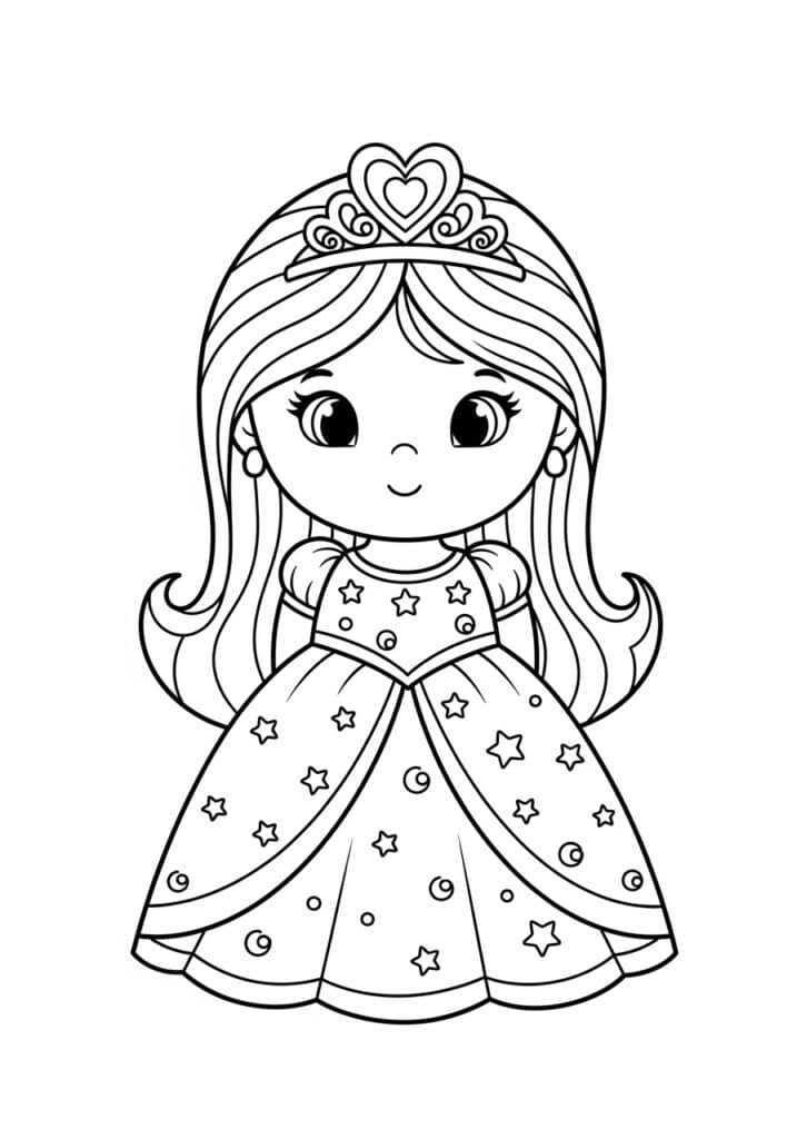 This little princess is honestly the cutest thing on the page and she knows it. The design features a big-eyed chibi style princess with an oversized head, large expressive eyes and the most gorgeous heart-shaped tiara sitting perfectly on top of her long wavy hair. Her dress is where things get really fun because the entire skirt is covered in a scattered pattern of stars, crescent moons and little circle motifs, giving it a magical celestial vibe that feels totally unique compared to a plain ball gown. The lines throughout are clean and confident, with slightly thicker outlines around the main figure and finer lines used for the dress pattern details. The overall layout is centered and compact, making the whole design feel very focused and satisfying to look at.