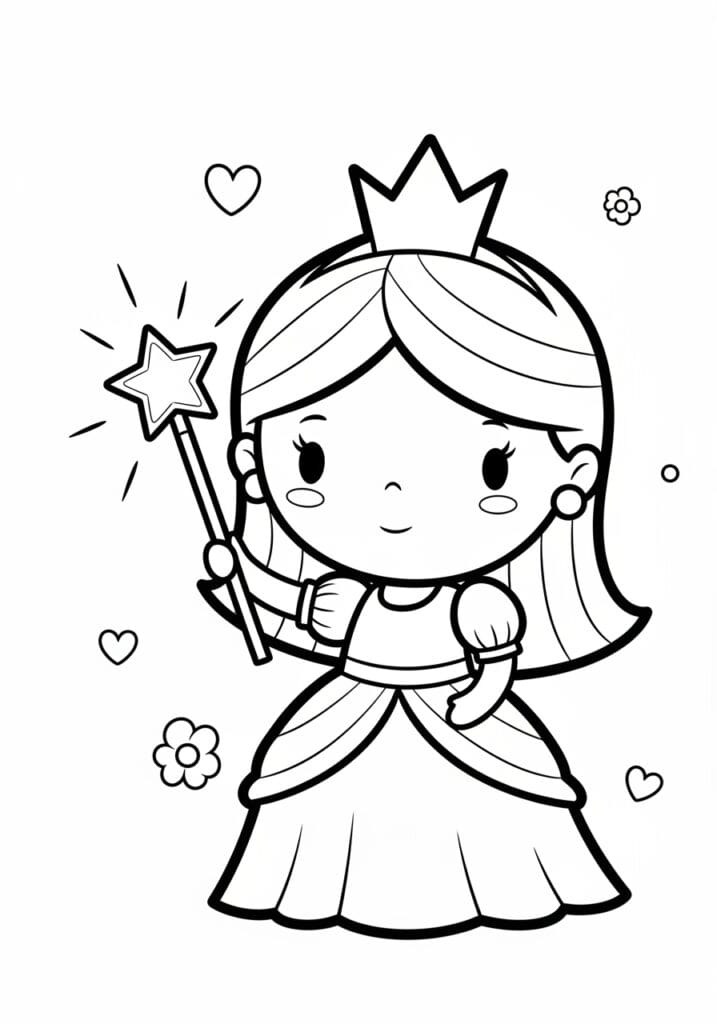 This page has such a playful, lighthearted energy that it’s hard not to smile looking at it. The design features a super cute kawaii-style princess with a round face, rosy cheeks and a simple pointed crown on top of her short hair. She’s holding a star-tipped magic wand in one hand with little sparkle lines radiating out from the star to show it’s glowing with magic. Her outfit is a layered tiered skirt with clean simple lines, and the whole figure is drawn with thick bold outlines that give it that satisfying chunky cartoon look. Scattered around her in the white space are tiny floating hearts, small daisy flowers and a few simple circles, keeping the background feeling whimsical and lively without being too cluttered or overwhelming.