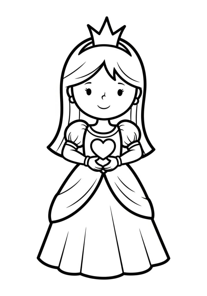There is something so genuinely wholesome about this design that it just makes you feel warm inside. It shows a simple, cartoon-style princess standing front and center, gently cradling a large heart shape in both hands right at her chest. She has straight shoulder-length hair, a classic pointed crown, little drop earrings and the softest smile on her face. Her dress is a full-skirted ball gown with puffed sleeves and a pleated skirt hem, all drawn with thick confident outlines that keep everything clean and very easy to color within. The overall design is beautifully uncluttered with no background elements at all, so the princess and that sweet heart shape are the complete focus of the page.