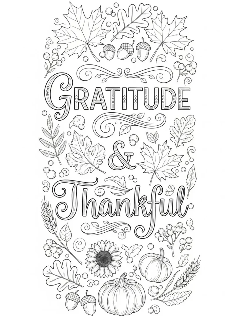 This coloring page is a feast for the eyes with its gorgeous hand-lettering declaring “Gratitude & Thankful” styled with an elaborate, slightly vintage feel. The text is framed by an abundance of classic fall motifs drawn in clean black outlines with varying line weights that give the design depth. You’ll find intricate maple and oak leaves scattered throughout, alongside cute little clusters of berries, plump acorns, a detailed sunflower, and, of course, a couple of delightful pumpkins at the bottom. The whole composition is framed by decorative swirls and flourishes which really tie the whole autumn harvest theme together perfectly.