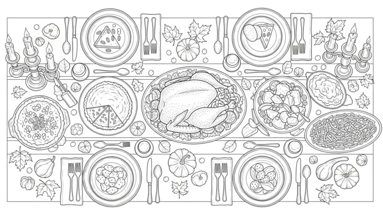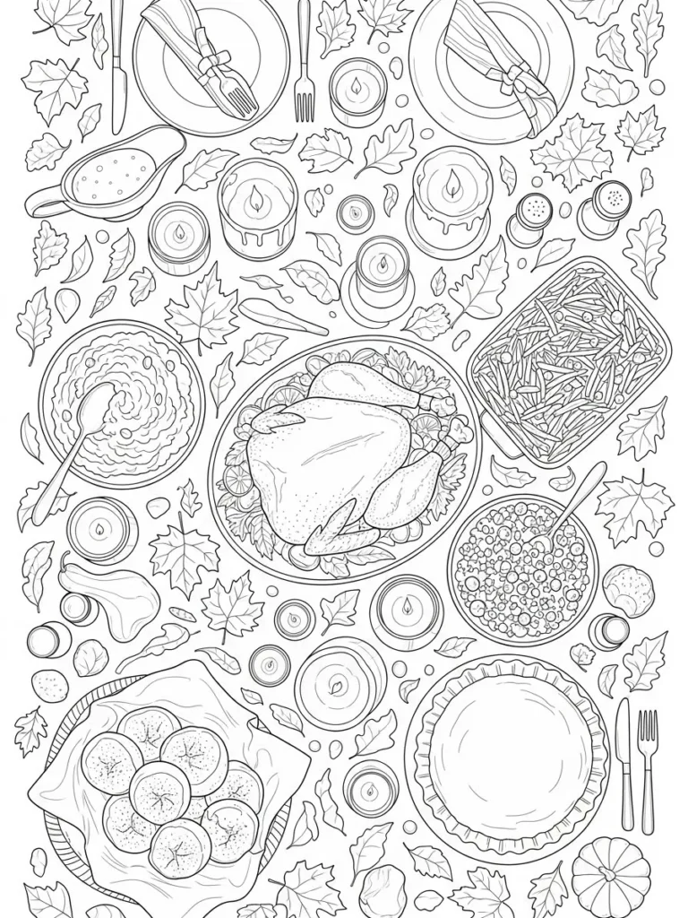 This coloring page offers a bird’s-eye view of the most glorious, abundant Thanksgiving dinner table imaginable, completely filled with delicious things! The composition is a busy, detailed pattern of dishes meant to represent every classic side. We see the beautifully roasted turkey centerpiece resting on greens, surrounded by bowls of mashed potatoes, stuffing, and what looks like green bean casserole. There’s a lovely pie crust waiting for filling, dinner rolls on a platter, a gravy boat, salt and pepper shakers, and lots of flickering tea light candles interspersed among scattered autumn leaves. The line art is detailed perfect for keeping your coloring focused across the many individual elements.