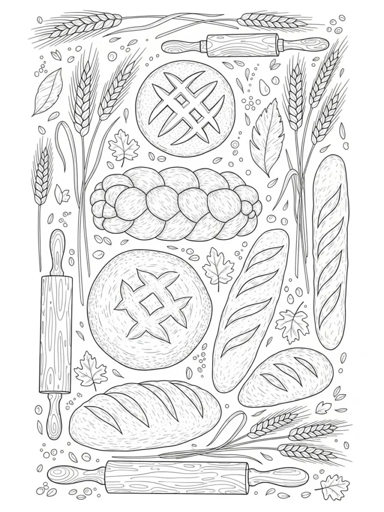 This page is super fun for coloring because I can pretend I just pulled these amazing loaves out of the oven. I love that there is texture shading already included on the bread because it gives me a perfect guide for where to apply my darker browns and golden crust tones. If you enjoy coloring food items this one is a real treat for the eyes. I find the repetition of the rolling pins and wheat soothing almost like a pattern itself perfect for zoning out and just enjoying the process.