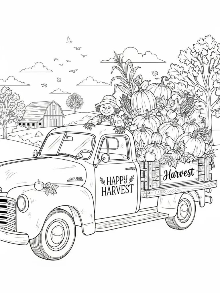 This illustration captures the quintessential image of a successful autumn haul loaded onto a charming, vintage pickup truck set against a pastoral backdrop. The line work is clean and detailed, especially evident in the classic truck design and the woven wood texture of the truck bed. The truck is overflowing with pumpkins, gourds, and ears of corn, with tall corn stalks rising above the load. Peeking over the cab is the friendliest little scarecrow, and the door features a sweet “Happy Harvest” script, while the bed has a framed “Harvest” sign. In the background, we see rolling hills, bare and leafy trees, a classic barn, and several little birds soaring under fluffy clouds.
