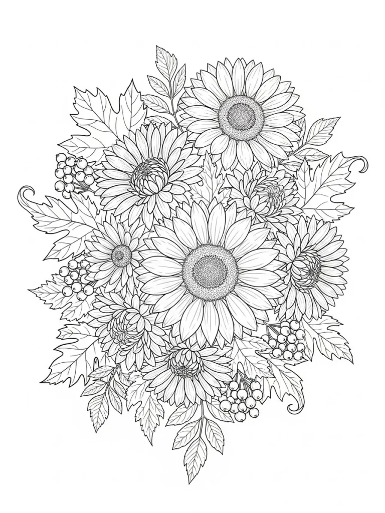 This page features a gorgeous, dense floral arrangement styled like a classic bouquet or centerpiece designed to celebrate the fall season. Dominating the design are several large, striking sunflowers surrounded by a variety of textured chrysanthemum-like blooms. The flowers are beautifully nestled among deeply lobed oak leaves and clusters of round berries filling out the composition perfectly. The entire bouquet is balanced and symmetrical yet feels natural and organic thanks to the flowing lines and detailed petal structures. The line thickness is consistent and clean providing great definition for coloring.