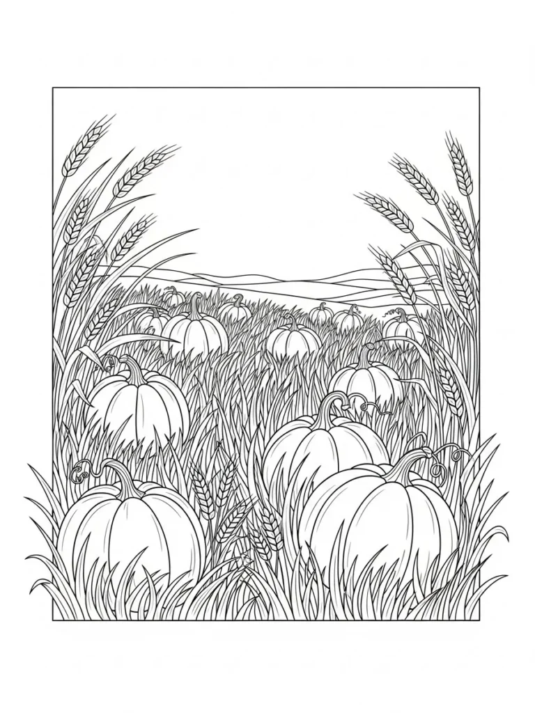 This coloring page presents a gorgeous landscape view of a pumpkin patch ready for picking, framed by tall stalks of wheat that guide the eye into the scene. The foreground is densely filled with round pumpkins and other gourds partially hidden by long blades of grass and wheat shafts, creating a wonderful sense of depth. The background shows gentle rolling hills under a cloudy sky, suggesting a wide open farm setting. The line work is clean on the main elements like the pumpkins but becomes very fine and delicate for the individual blades of grass and the wheat heads, which adds a lovely level of complexity.