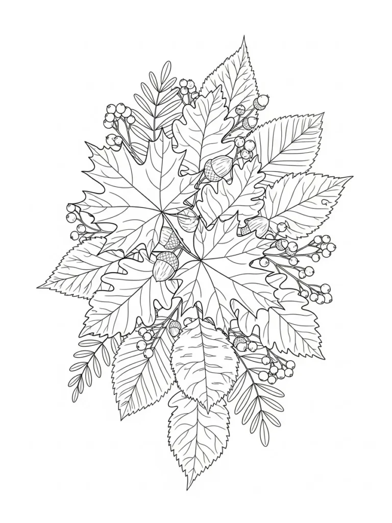 This coloring page presents a beautifully composed, compact cluster of fall foliage and small natural elements designed to function as a decorative accent or corner motif. The design is richly layered, featuring several large, identifiable maple leaves mixed with oak leaves and some finer, fern-like sprigs. Tucked between the foliage are clusters of small round berries and a few perfectly drawn acorns providing that classic woodland touch. The line work is clean and balanced, with fine lines used inside the leaves to suggest veins and texture, making this a wonderfully tactile image to color.