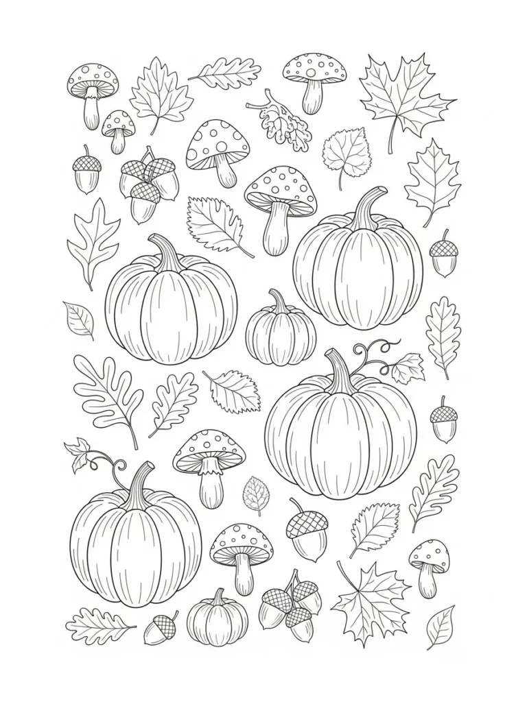 This design is a cute, almost storybook-style scattering of classic autumn treasures covering the entire page in a delightful pattern. We have an assortment of beautifully rounded pumpkins in varying sizes mixed in with a whole bunch of different fall leaves, likely maple and oak varieties, all outlined simply yet charmingly. Adding a touch of woodland magic are several spotted toadstool mushrooms sprinkled amongst the foliage and plenty of clusters of acorns scattered here and there. The line work is consistent and friendly perfect for easy coloring without too many fiddly tiny details.