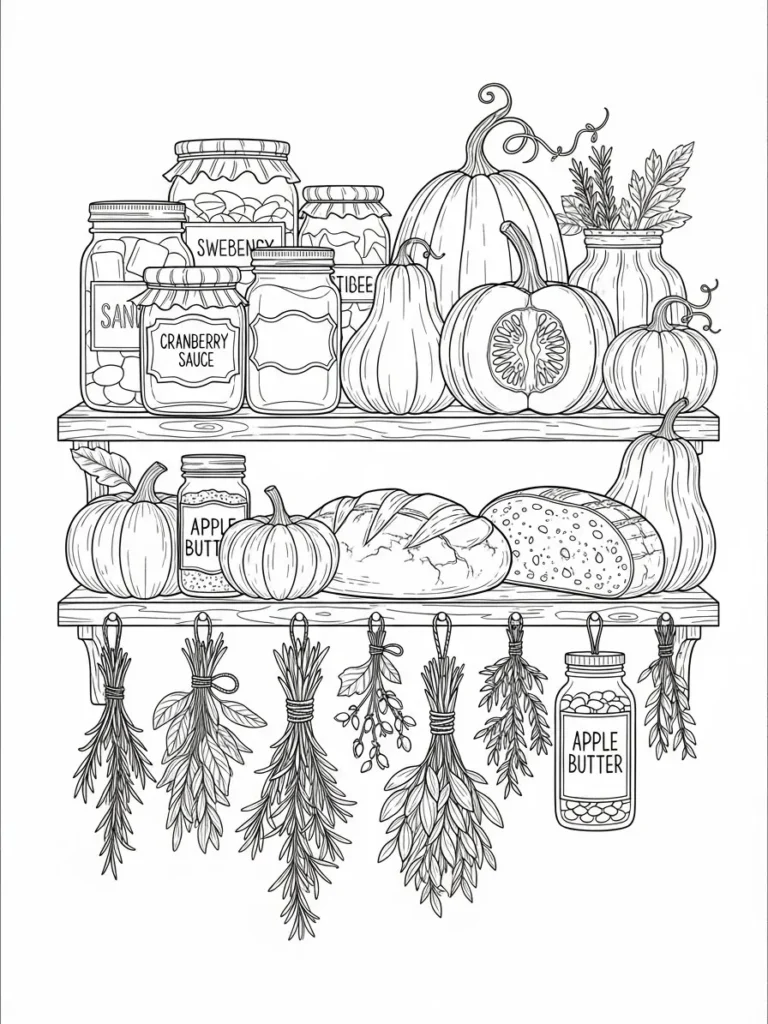 This coloring page beautifully captures the essence of a well-stocked autumn pantry displayed across two rustic wooden shelves. The upper shelf is overflowing with various glass jars filled with preserves like cranberry sauce and what looks like candied yams, alongside an array of squash and pumpkins, including one perfectly halved to show its seeds. The bottom shelf features smaller pumpkins, crusty loaves of artisan bread, and a jar of apple butter hanging alongside multiple detailed bundles of drying herbs tied with twine. The line work is crisp and clear allowing all those wonderful textures like the glass jars and the bread crusts to really stand out.