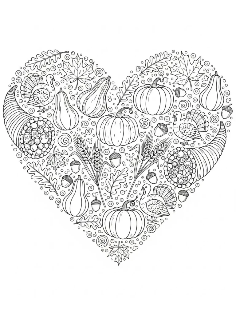 This coloring design packs tons of traditional Thanksgiving goodies into one large, charming heart shape filling the entire page. The outline of the heart is created organically by arranging all the motifs together without any harsh border lines. Inside we find adorable little turkeys standing amongst wheat stalks, various plump pumpkins and gourds, and two richly filled cornucopias symbolizing abundance. Scattered throughout this festive medley are lots of lovely oak leaves, acorns, and little decorative swirls that fill all the remaining spaces beautifully. The line thickness is uniform and perfect for a delightful, flowing coloring session.