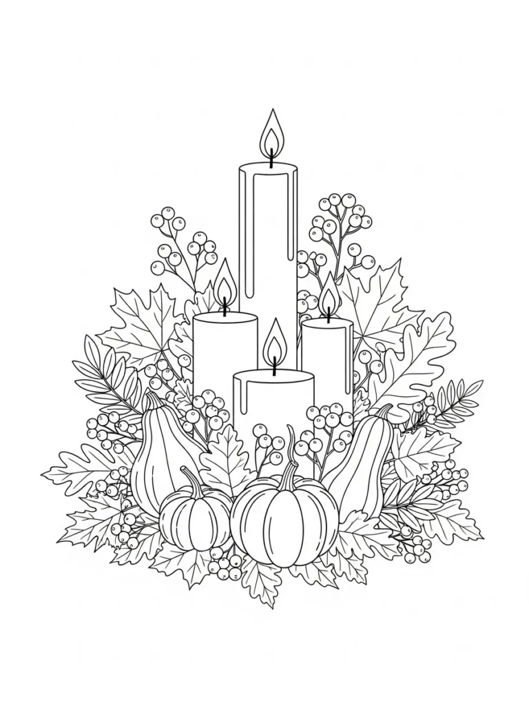 This coloring page centers around a beautiful, tranquil arrangement featuring four lit candles of varying heights nestled among a rich bounty of fall elements. The thick candles have beautiful wax drips suggesting a soft, warm glow. Surrounding this centerpiece is a dense, textural bed made up of layered maple and other textured leaves, clusters of small berries on delicate branches, and several rounded pumpkins and smooth squash shapes. The black line art is clean and well-defined, making each element distinct and ready for color application.
