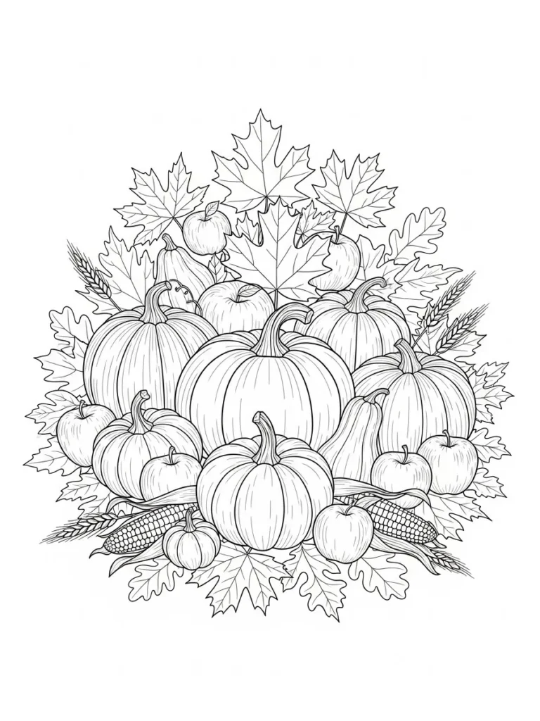 This page features a classic, bountiful display of harvest items gathered together in a beautiful central cluster. The composition is dominated by a generous assortment of round pumpkins and elongated gourds stacked upon one another, creating lovely overlaps and dimension. Interspersed among the squash are several crisp apples and striking ears of corn with husks peeking out. Framing the entire arrangement are broad maple leaves and delicate stalks of wheat rising up on either side, giving the design height and an overall feeling of plenty. The line work is very clean, giving crisp definition to the ribs on the pumpkins and the texture of the corn kernels.
